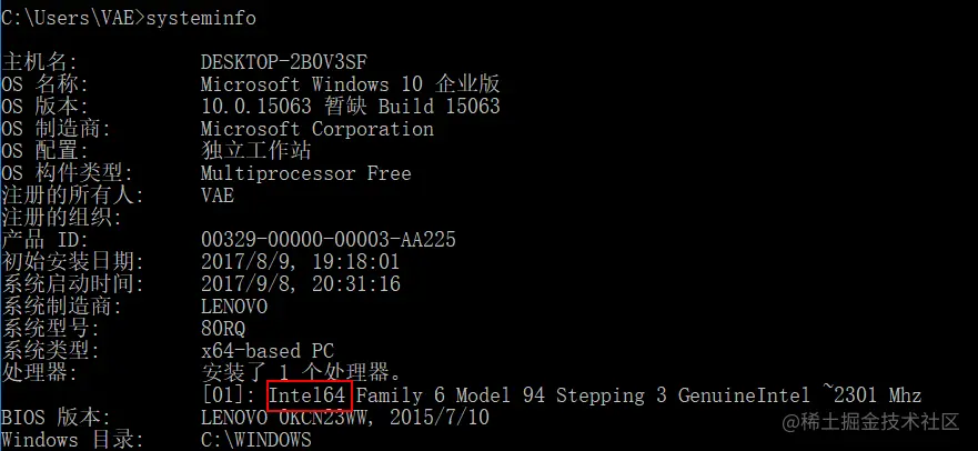 比如:LZ 打开命令提示符,然后输入 systeminfo,可以看到处理器的位数是 64 位