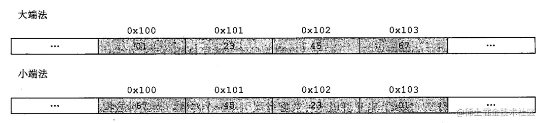 回到上面的变量 x,如果假设 x 的低位字节值到高位字节值分别为 67,45,23,01。那么用大端法和小端法表示分别如下: