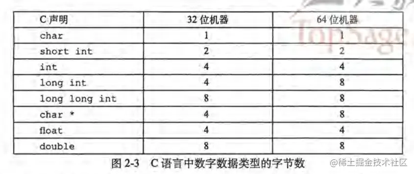 计算机和编译器支持多种不同方式编码的数字格式,比如整数和浮点数,以及其它长度的数字。而且由于计算机位数的不同,会造成计算机在各种数据类型分配的字节数不一样。下图是 C 语言在 32位机器和64 位机器上各种类型所分配的字节数对比。