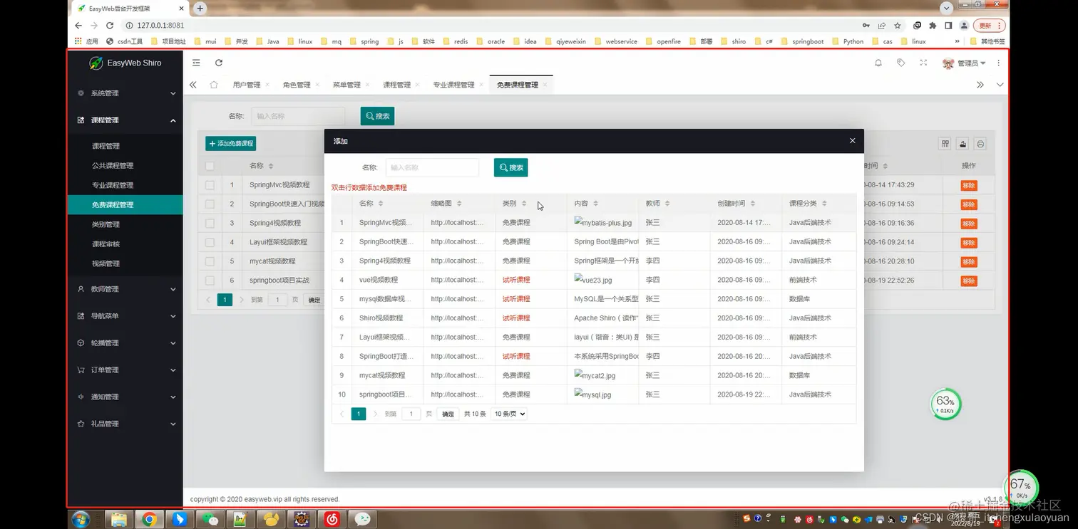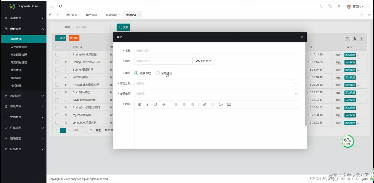 课程管理:对课程进行管理支持增加删除修改、可以发布视频或者图片