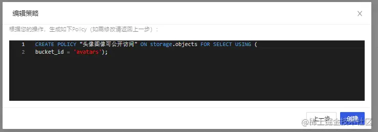 点击"新规则"按钮,在弹出弹框中,选择"为所有用户启用访问权限",输入策略名称,选择"SELECT(查询)"操作,点击“创建策略”按钮,如下图。