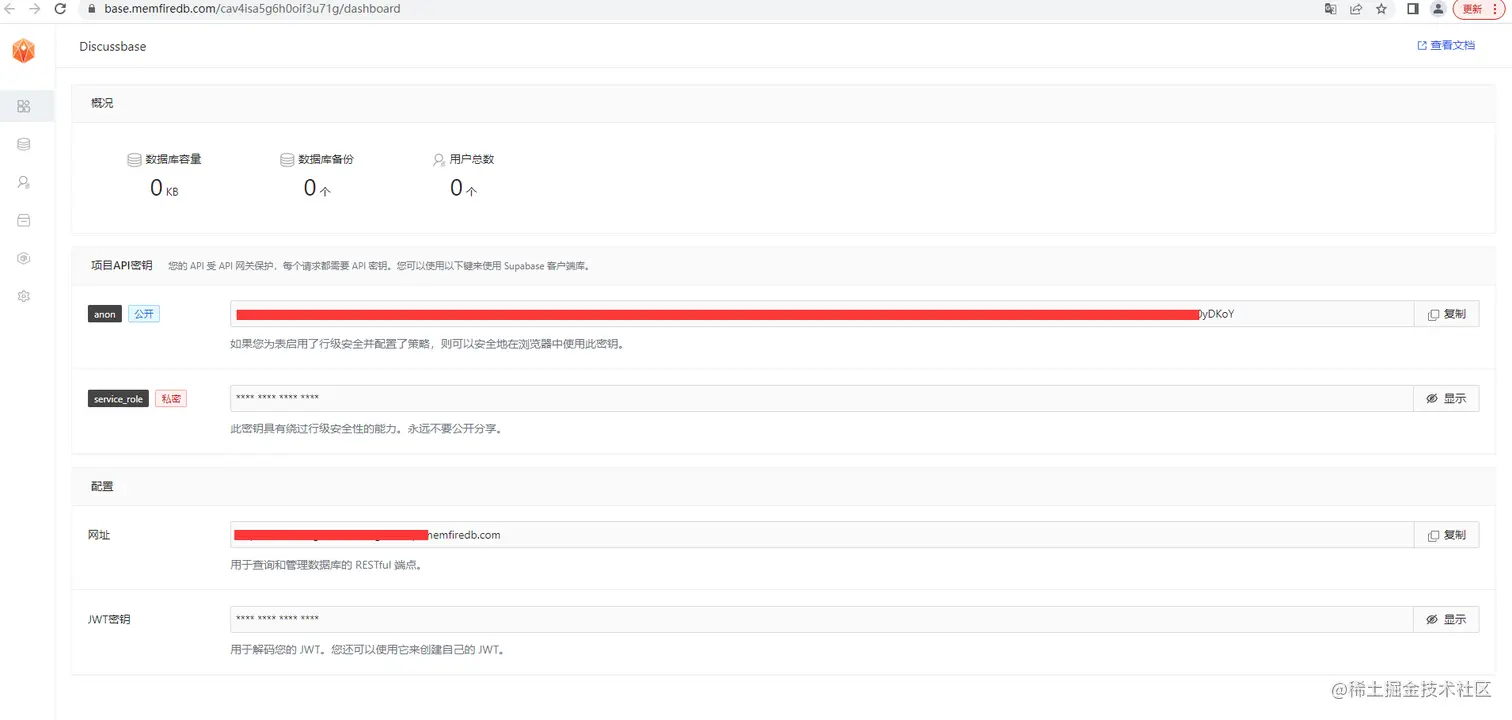 注意:service_role(秘密)密钥可以绕过任何安全策略完全访问您的数据。这个密钥必须保密,并且要在服务器环境中使用,绝不能在客户端或浏览器上使用。 在后续示例代码中,需要提供supabaseUrl和supabaseKey。