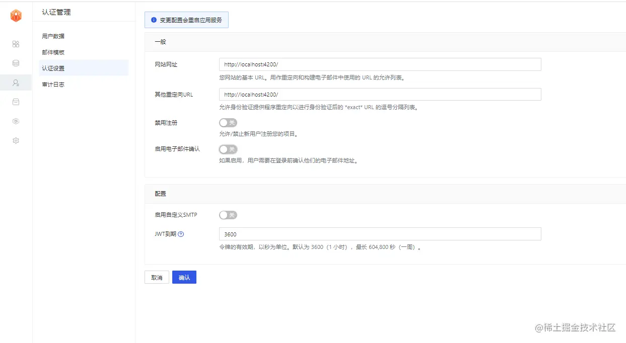 当用户点击邮件内魔法链接进行登录时,是需要跳转到我们应用的登录界面的。这里需要在认证设置中进行相关URL重定向的配置。