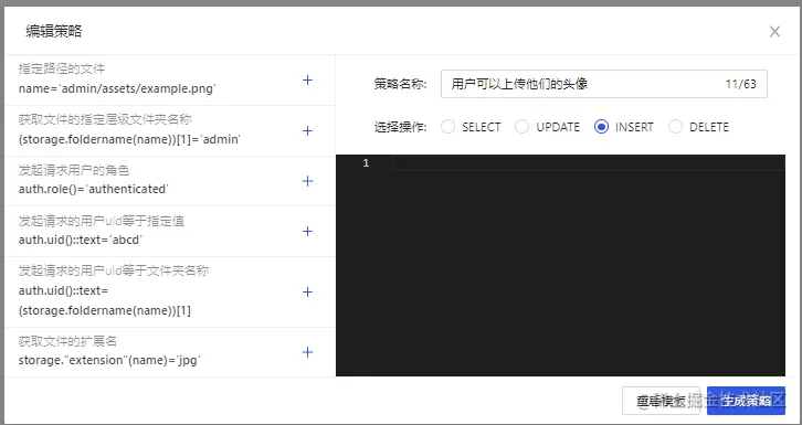 选择INSERT操作,输入策略名称,点击“生成策略”按钮,如下图所示。