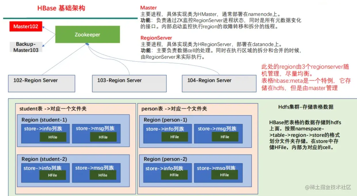 HBase 通过 Zookeeper 来做 master 的高可用、记录 RegionServer 的部署信息、并且存储有 meta 表的位置信息。 HBase 对于数据的读写操作时直接访问 Zookeeper 的,在 2.3 版本推出 Master Registry模式,客户端可以直接访问 master。使用此功能,会加大对 master 的压力,减轻对 Zookeeper的压力。
