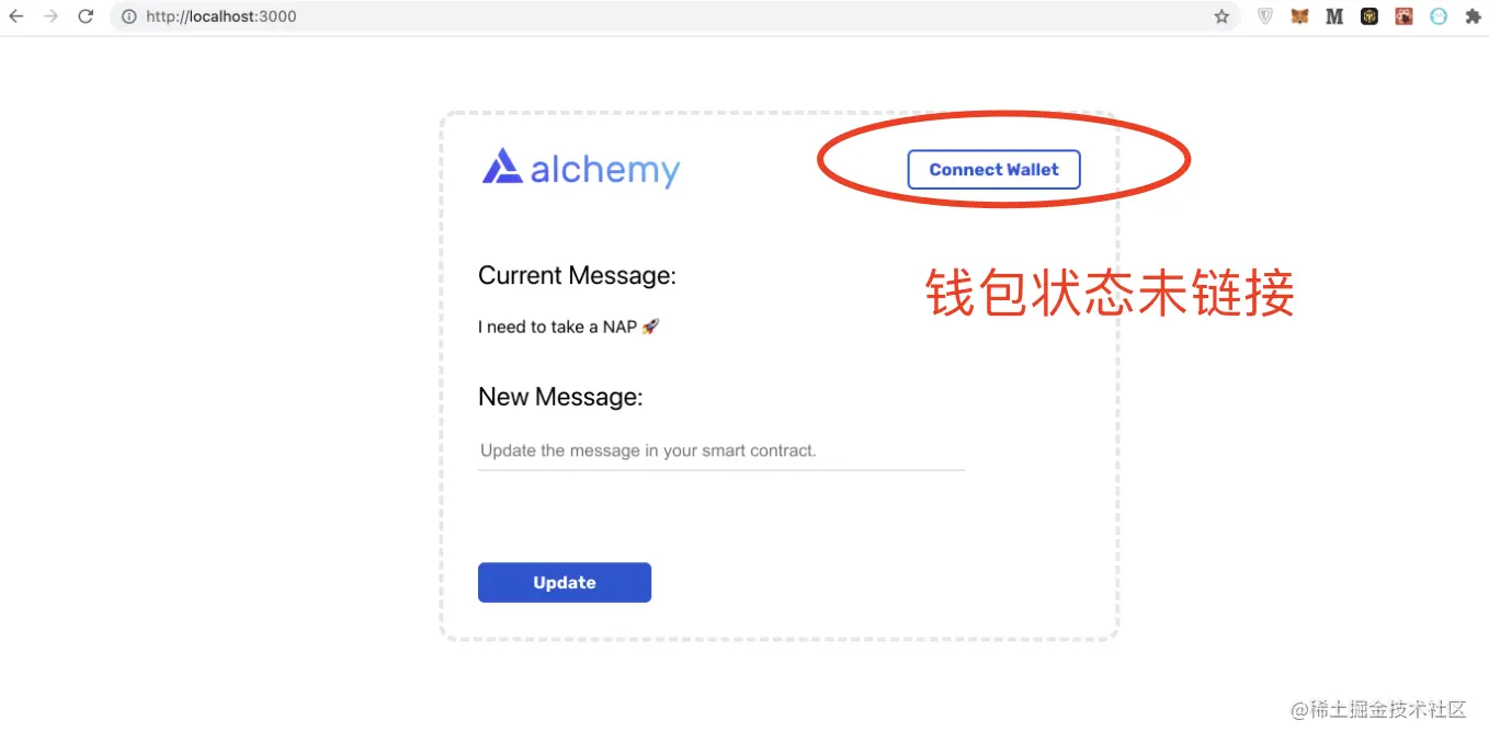 updateMessage 此功能将更新存储在智能合约中的消息。它将对 Hello World 智能合约进行写调用,因此用户的 Metamask 钱包将必须签署以太坊交易的更新消息。。