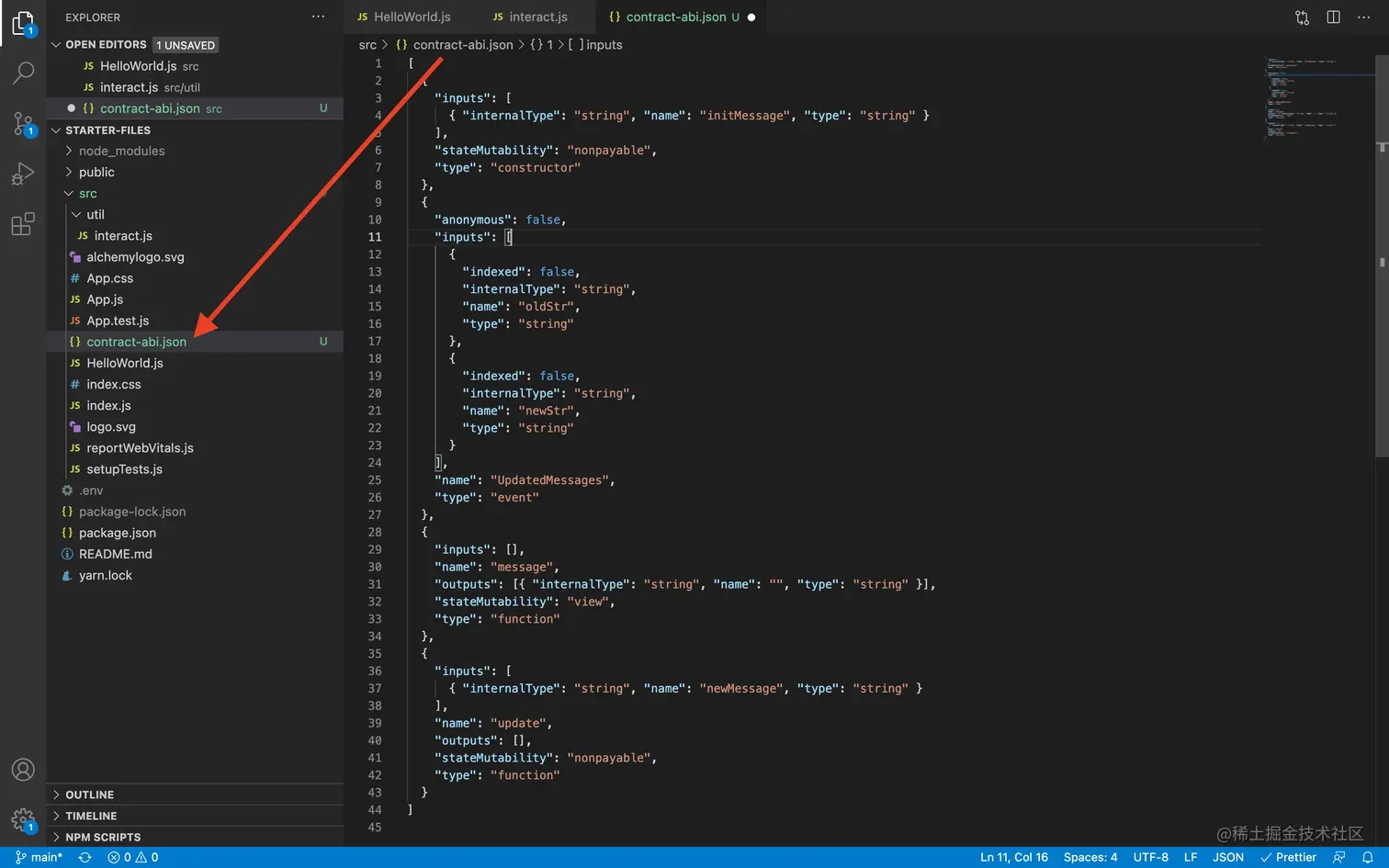要加载你的 Hello World 智能合约,你需要它的合约地址和 ABI,如果你完成了前面的教程,你可以remix 里面找到他。然后copy其内容 并在工程里创建 加contract-abi.josn (后面调用时会引用该文件)。