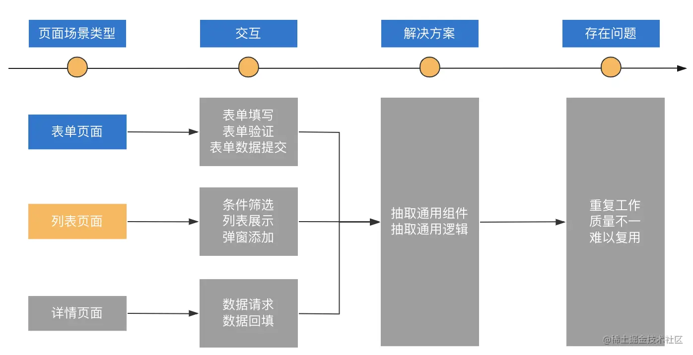 - 业务 70%到 80%都是图表、表单、表格之类的 curd 操作,组件、数据逻辑处理比较重复