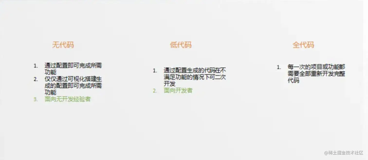- 搭建、配置的过程,需要了解一定的开发体系知识,上手成本超过无代码