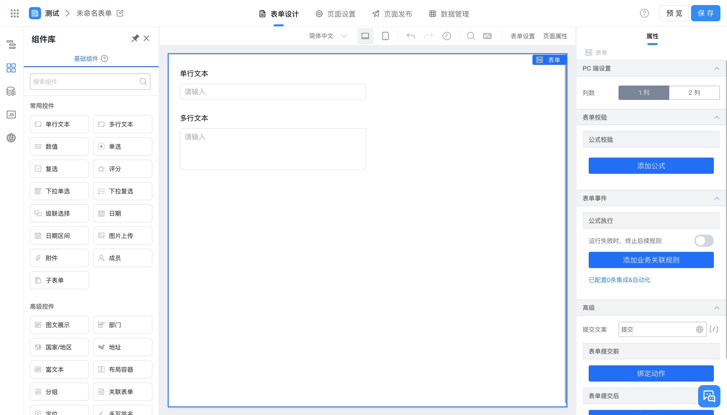 业界太多的低代码平台,不一一展示,大家都大同小异,功能包含页面大纲树、组件面板、属性面板、国际化等核心能力