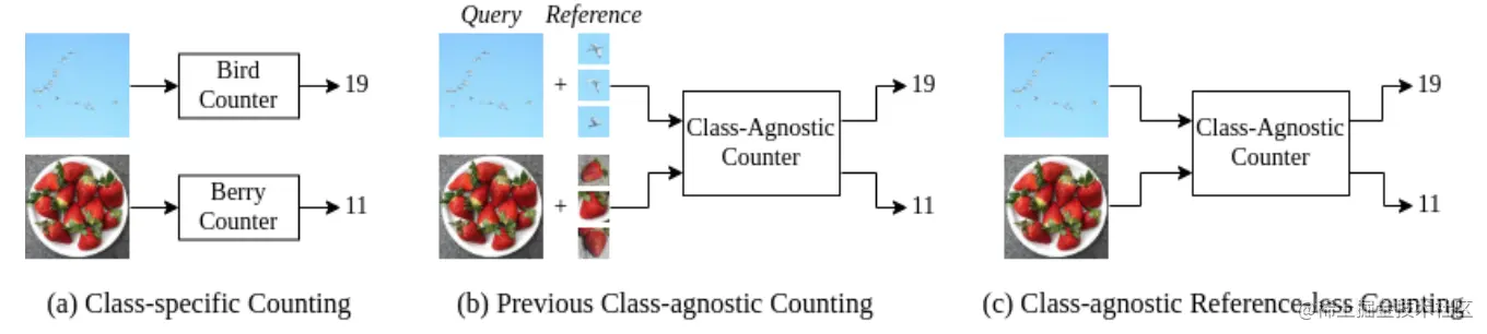 论文简介:While there are class-agnostic counting methods that can generalise to unseen classes, these methods require reference images to define the type of object to be counted, as well as instance annotations during training./虽然有一些与类无关的计数方法可以推广到未见过的类,但这些方法需要参考图像来定义要计数的对象的类型,以及在训练中的实例注释。