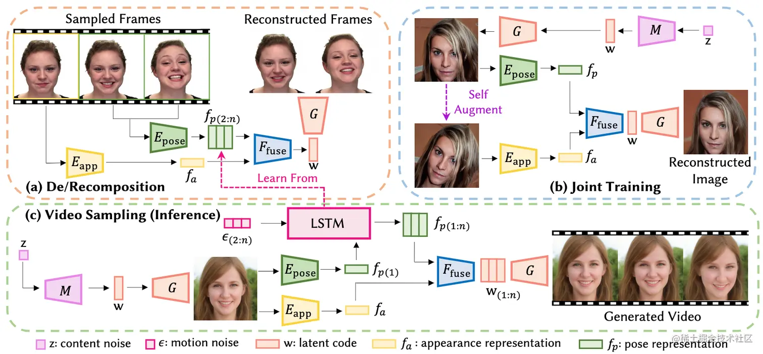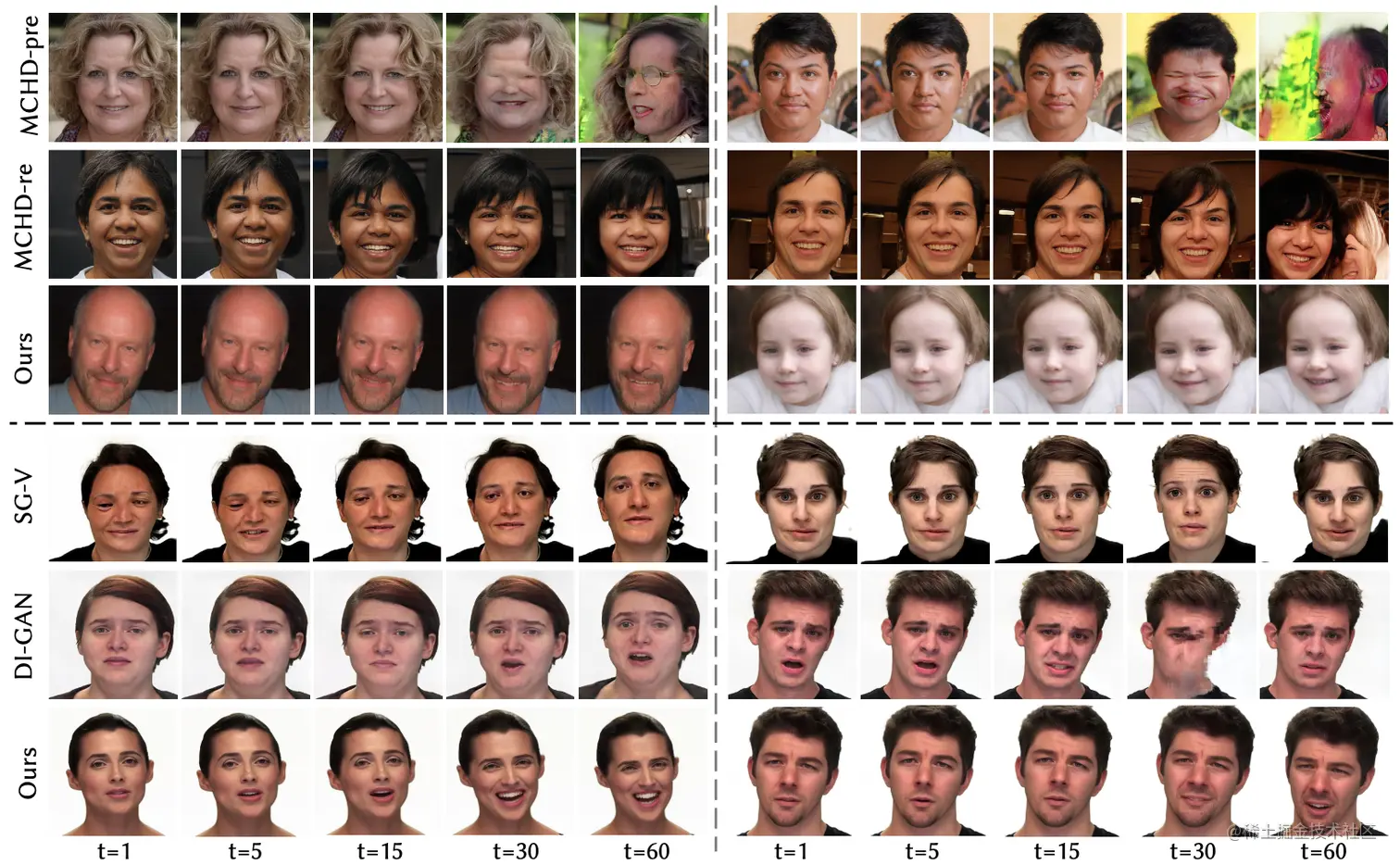 论文简介:Notably, StyleFaceV is capable of generating realistic 1024×1024 face videos even without high-resolution training videos./值得注意的是,即使没有高分辨率的训练视频,StyleFaceV也能生成真实的1024×1024人脸视频。