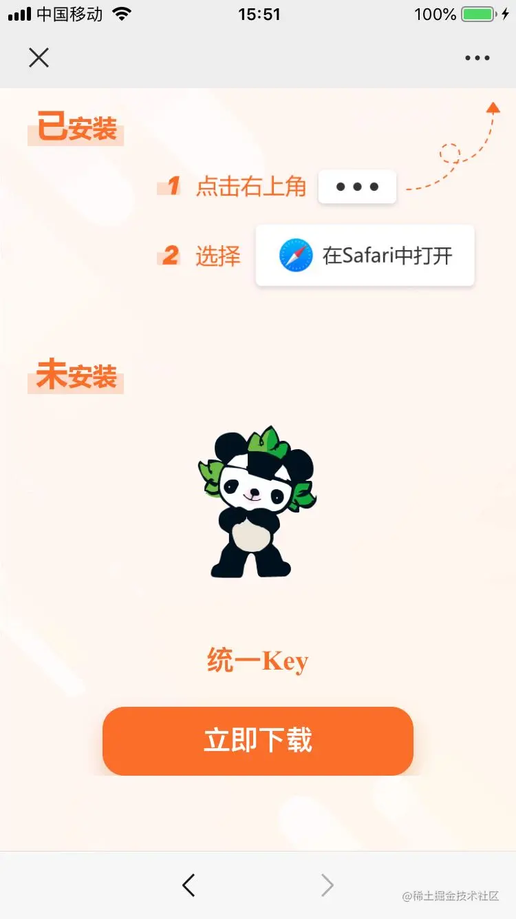 iOS端这里修改的是微信里跳转的界面,当app没有安装的时候,在微信里点击分享的链接,会先跳转到一个引导页,修改的是这里的,如下图: