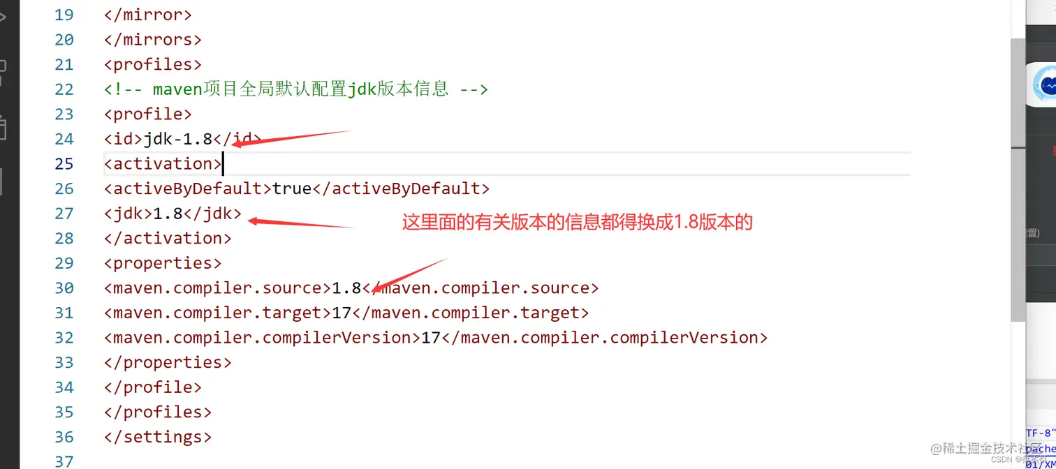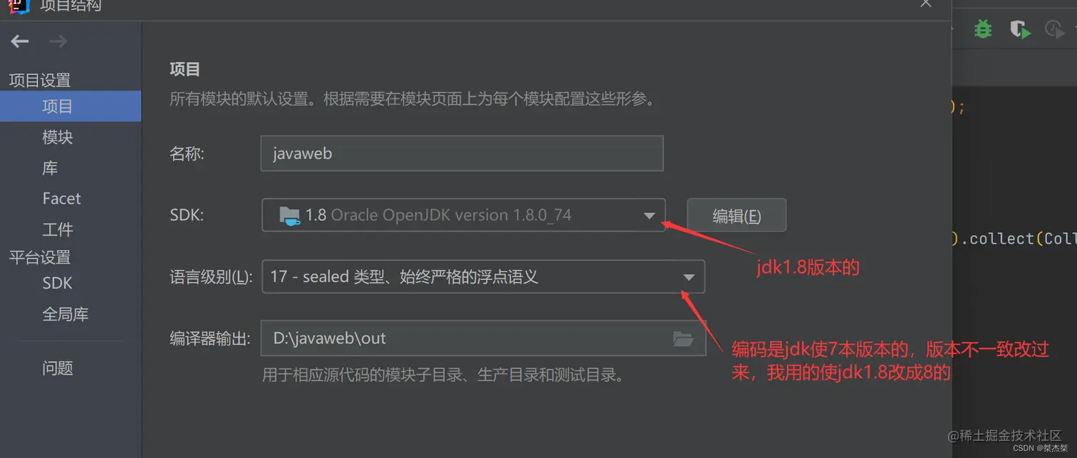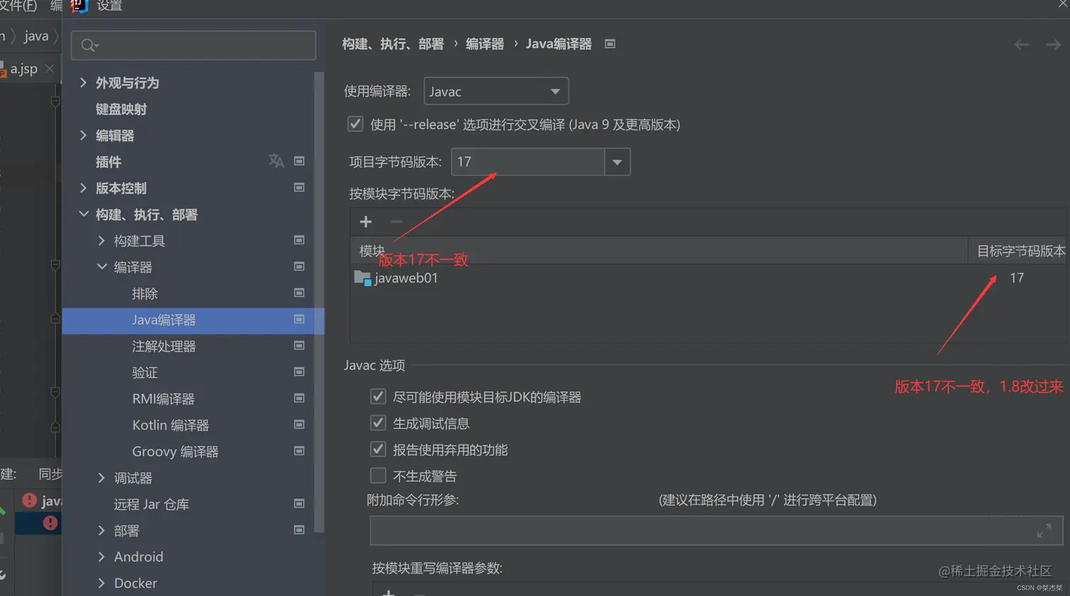 部署javawe项目报错:ava: 无效的目标发行版: 17 用户5699974231024 2022-08-25 267 阅读1分钟 分析原因: 可能是:jdk的版本与web项目配置版本不一致造成的,又或者:与maven项目的配置文件里的版本配置不一致造成的 解决方案:所有设置都看一遍更改一值 1,先查看项目结构设置 2,检查javac编译设置是否正确,修改有关版本配置信息! 3,打开电脑下载的maven的目录下conf文件夹,修改配置文件类有关jdk的版本信息。