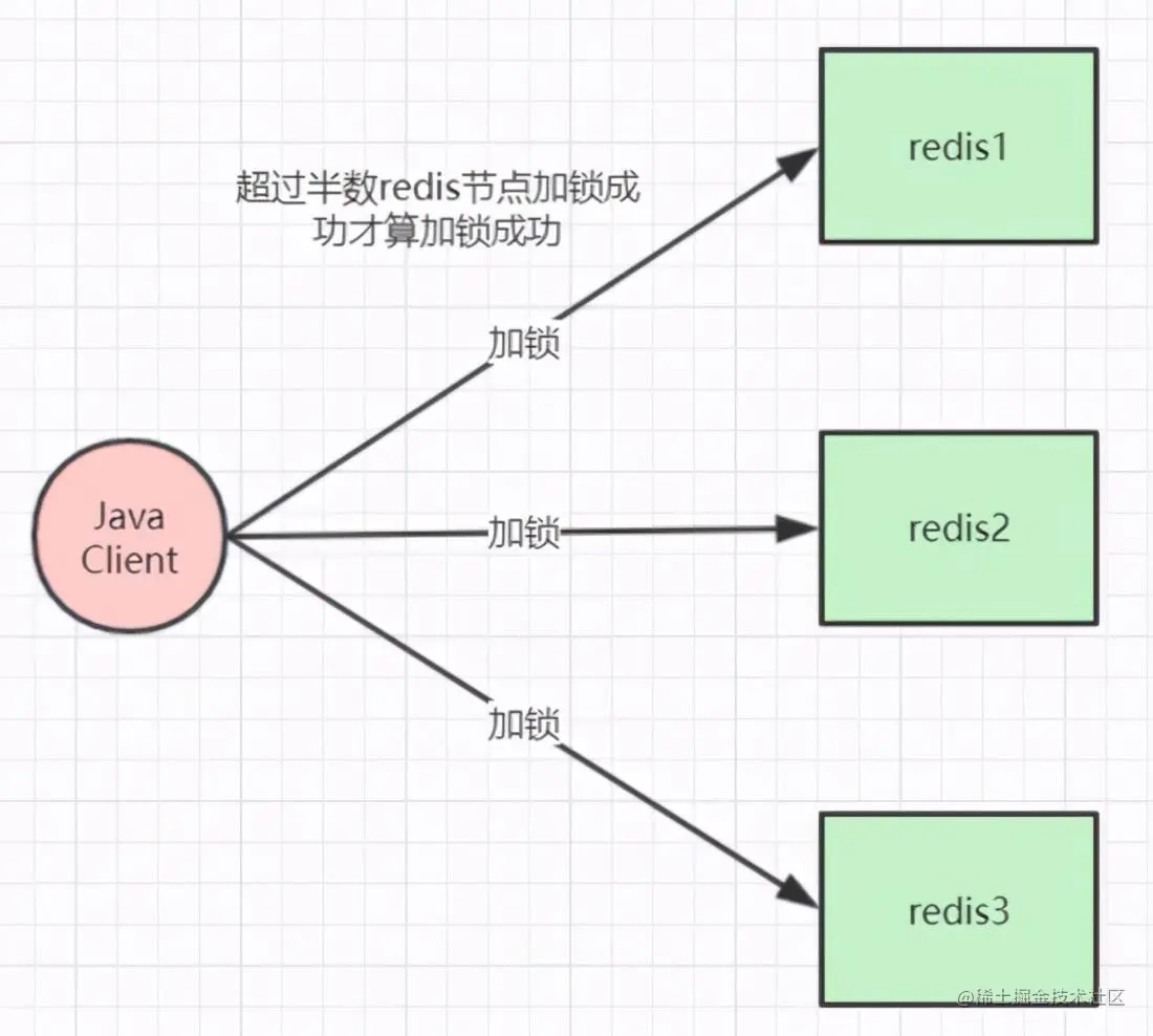 假设有3个redis节点,这些节点之间既没有主从,也没有集群关系。客户端用相同的key和随机值在3个节点上请求锁,请求锁的超时时间应小于锁自动释放时间。当在2个(超过半数)redis上请求到锁的时候,才算是真正获取到了锁。如果没有获取到锁,则把部分已锁的redis释放掉。