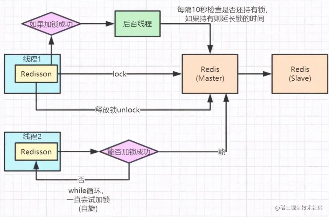 - 加锁成功,锁超时时间 默认30s ,并开启后台线程,加锁的后台会 每隔10秒 去检测线程持有的锁是否存在,还在的话,就延迟锁超时时间,重新设置为30s,即 锁延期 。