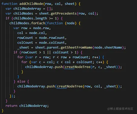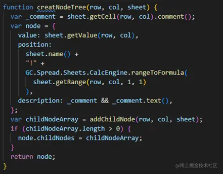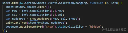 为了能够在点击单元格的时候,提前将公式树绘制好,这里用了一个事件监听,当监听到选区改变的时候,分别调用创建节点以及绘制公式树的方法(后面会进行介绍)。然后将用显示公式树的spreadForShow这个工作簿进行隐藏。因为我们的主要逻辑是通过右键显示公式树,然后切换单元格的时候关闭公式树。