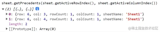 以上就是一些前期的准备代码,我们再来看下如何获取公式的引用信息。通过sheet.getPrecedents(row, col)可以获取单元格中公式具体引用的单元格,返回的是一个对象数组。