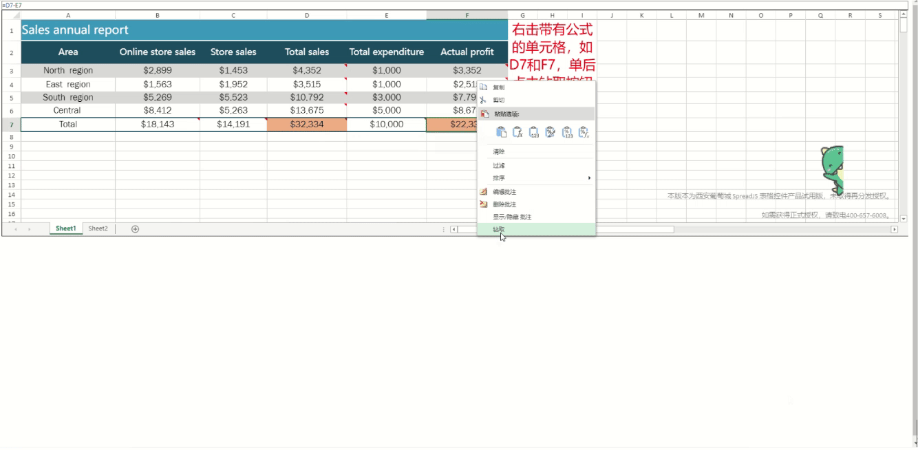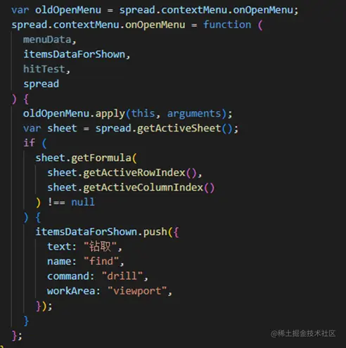 注册完对应的命令之后,为了能够让这个项只在由公式的单元格中出现,可以重写onOpenMenu。在这个方法里面通过getFormula判断点击的单元格是否有公式。有公式,则往右键菜单数组里面添加“钻取”项。