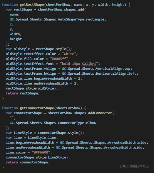 将公式对应的节点逐一找完之后,就可以开始在spreadForShow工作簿上进行绘制了。我们就分别绘制用于展示数据的矩形以及用于连接这些形状的连接器形状。下面的代码中getRectShape用于创建展示数据的矩形,里面通过代码设置了文本颜色、填充颜色、字体等。getConnectorShape则是用于创建线条连接器,设置了线宽、颜色等。