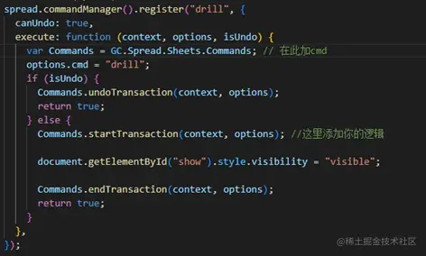 对应的,我们需要注册点击这个项之后的处理命令。该核心也就是作用主要在于, document.getElementById("show").style.visibility = "visible"; 是控制spreadForShow这个工作簿的显示。其余代码可以简单理解为创建命令的“模板”。详细注册命令可以参考以下链接: demo.grapecity.com.cn/spreadjs/Sp…