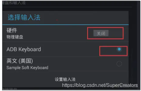 - 模拟器中安装ADBKeyBoard.apk并设置设置默认输入法为ADBKeyBoard,并关闭硬件物理键盘。