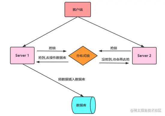 在一个分布式系统中,多台机器上部署了多个服务,当客户端一个用户发起一个数据插入请求时,如果没有分布式锁机制保证,那么那多台机器上的多个服务可能进行并发插入操作,导致数据重复插入,对于某些不允许有多余数据的业务来说,这就会造成问题。而分布式锁机制就是为了解决类似这类问题,保证多个服务之间互斥的访问共享资源,如果一个服务抢占了分布式锁,其他服务没获取到锁,就不进行后续操作。大致意思如下图所示: