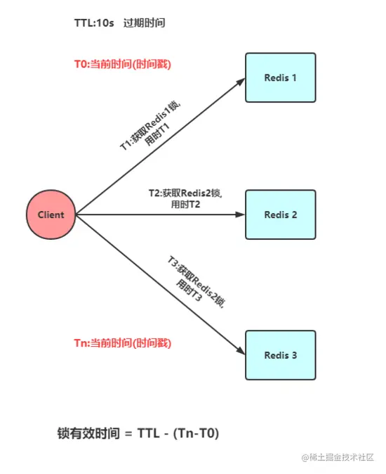 - 如果取到了锁,key的真正有效时间等于有效时间减去获取锁所使用的时间(步骤3计算的结果)。
