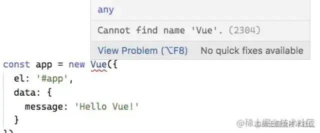 这样就不会报错了,使用 declare 关键字,相当于告诉 TS 编译器,这个变量(Vue)的类型已经在其他地方定义了,你直接拿去用,别报错。