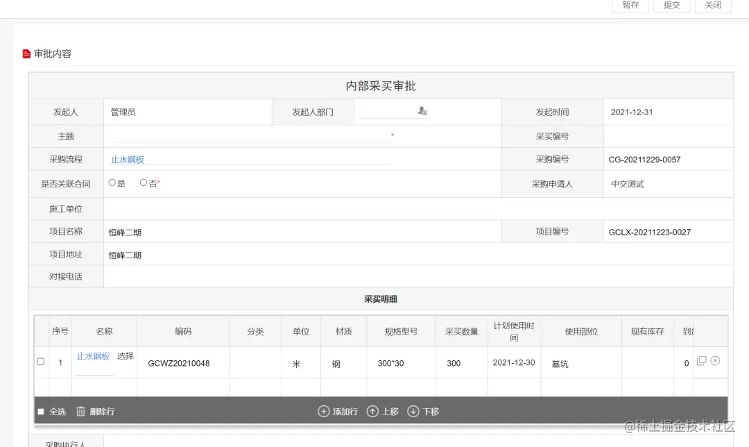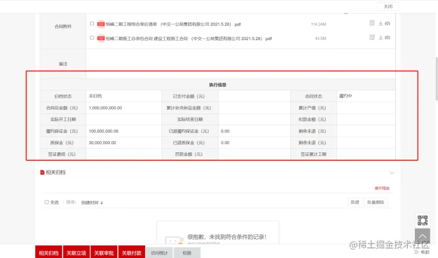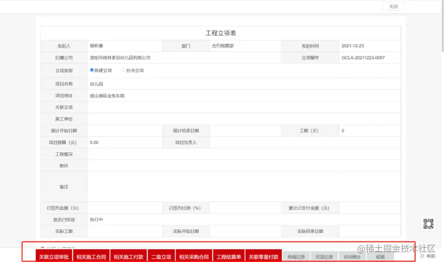 针对这些情况,恒峰地产通过蓝凌低代码平台搭建「工程预算管理」,分为工程立项-合同阶段-履约阶段3个阶段管理,数据相互关联。让合同总额受到工程预算的控制,付款金额受到合同金额的控制,保障项目在预算内执行。