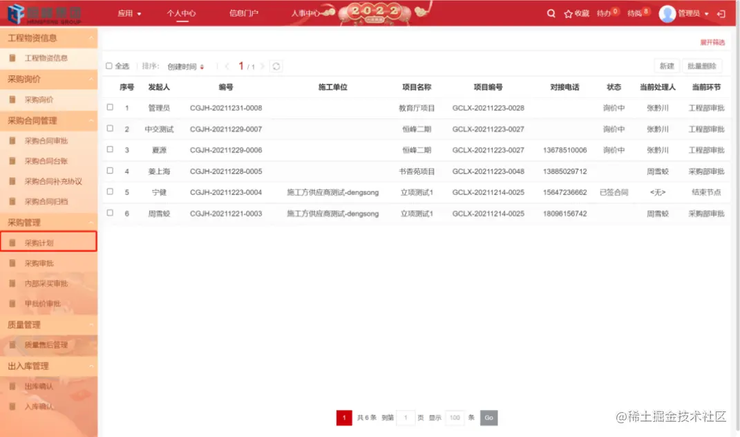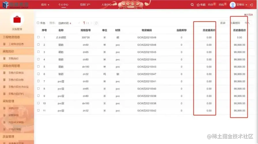 采购部:通过采购管理,对历史采购的最高最低价进行统计分析,并实现对工程物资申请、采购、询比价、库存、领用的管理;