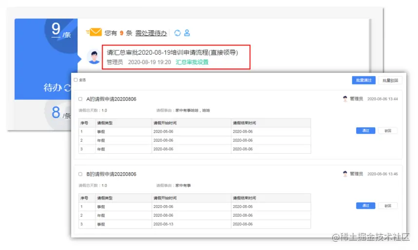 基于规则引擎构建,用户在进行表单填写和在表单审批时,辅助用户进行业务判断和决策。 流程汇总审批定时汇总待办/邮件,发送审批摘要,支持批量处理流程,减少信息干扰,工作专注高效。