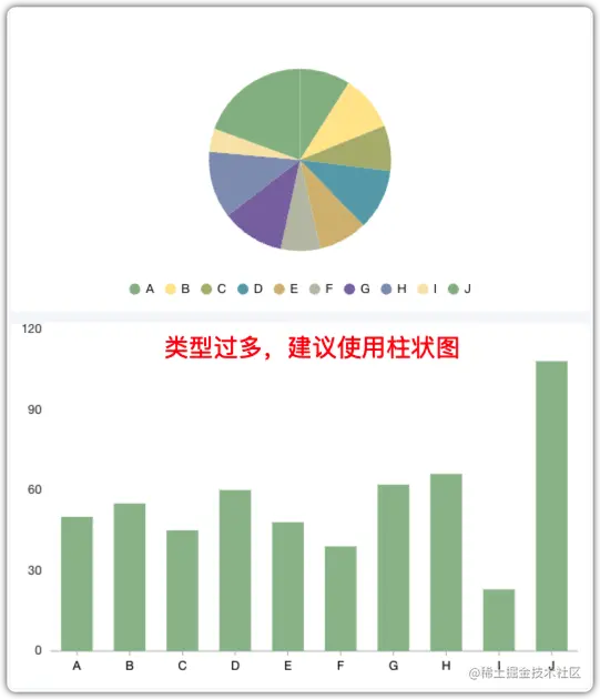 统计学家认为将饼图用于表达信息的效果很差。虽然饼图在商业领域和杂志中的使用很广泛,科学文献中却很少用到饼图。原因就是饼图用面积取代了长度,这样就加大了对各个数据进行比较的难度。根据史蒂文斯幂函数定律,面积只能提供 0.7 的感知力,而长度的感知力有 1.0。由于感知力的差异与实际差异呈线性相关,长度更适宜用于量度。