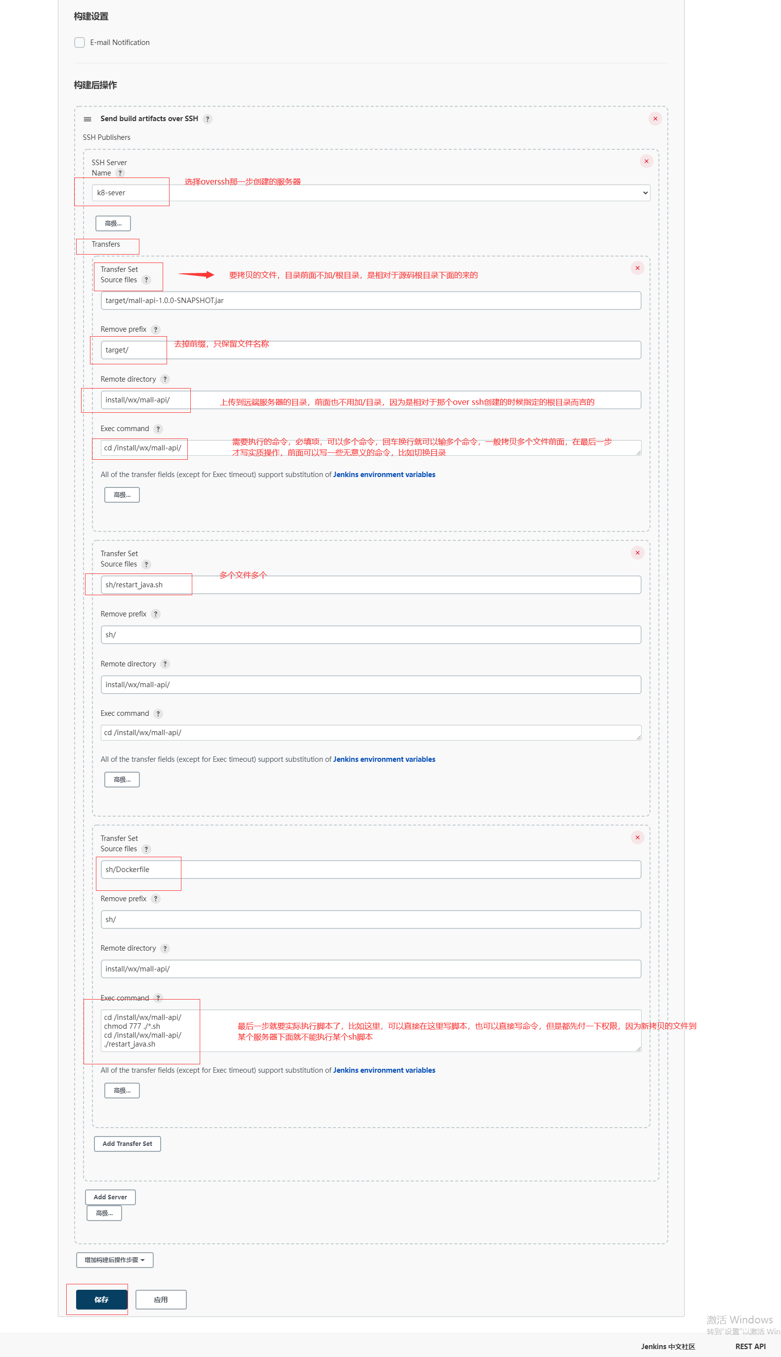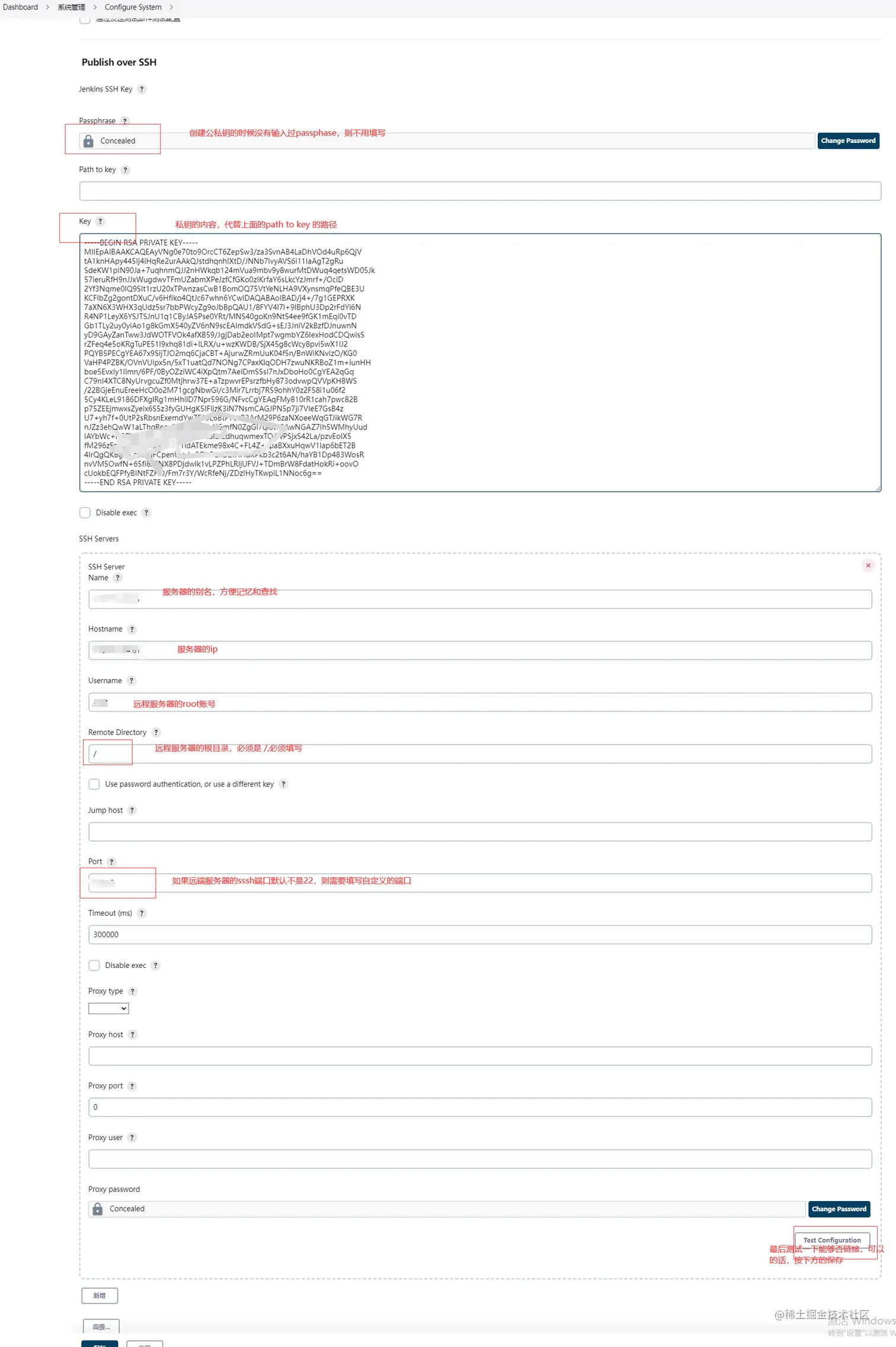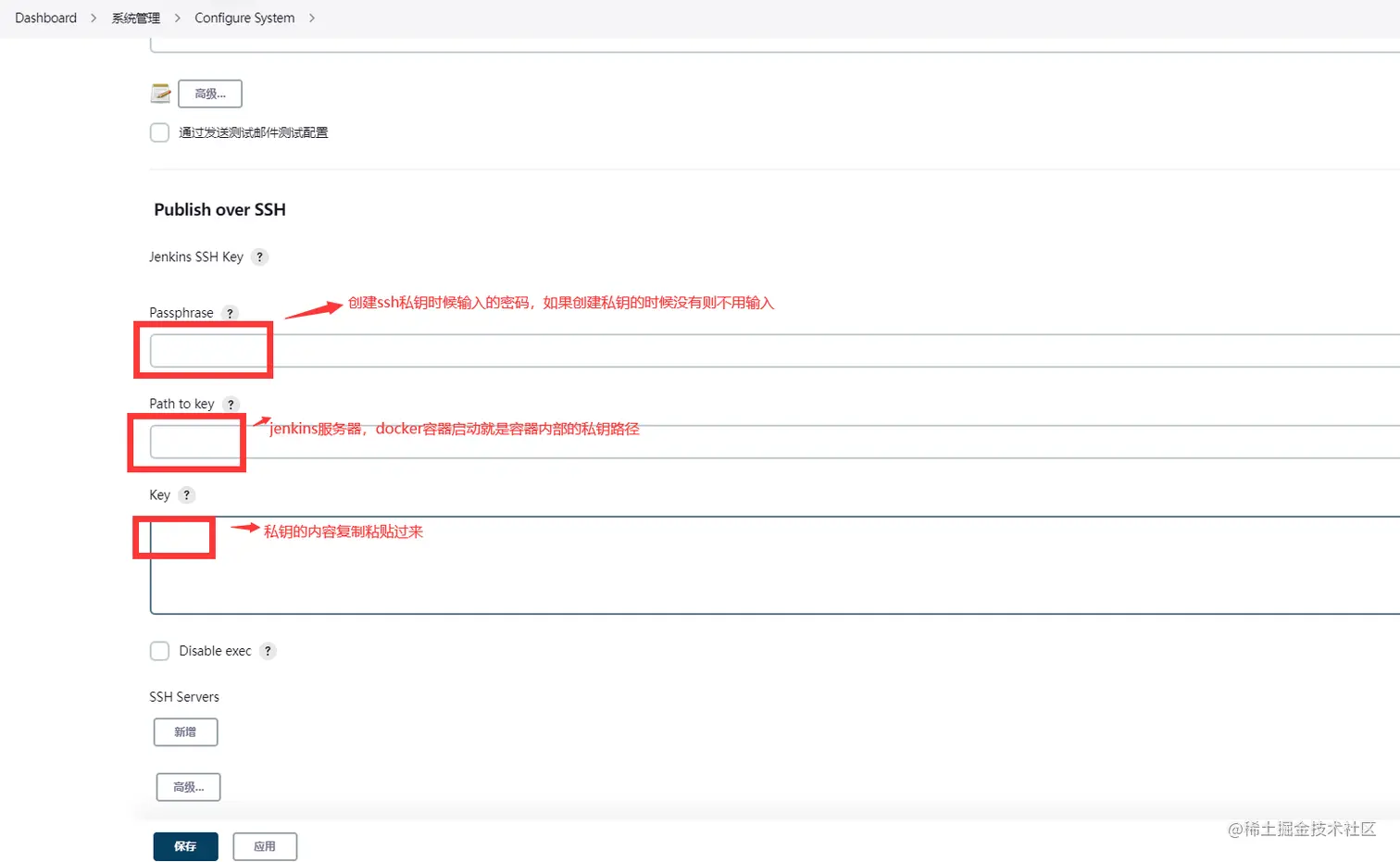配置 over SSH步骤2:在jenkins容器所在的宿主机(并非jenkins容器内部==>亲测容器内部生成的无效)生成ssh密钥和公钥,公钥发送到各个jenkins需要链接的服务器,这样就可以可以实现免ssh账号密码登录服务器,在宿主机执行 ssh-keygen生成公私钥,默认生成在 /root/.ssh 目录下面, id_rsa是私钥文件, id_rsa.pub 是公钥文件,然后执行 ssh-copy-id -i /root/.ssh/id_rsa.pub -p 服务器ssh端口,有的默认不是22端口 root@服务器IP将公钥文件发送到服务器,然后确认yes,输入服务器的密码即可, 链接多个服务器就需要执行多次该命令将文件发送到多个服务器 【经过验证该公钥和私钥还是要在jenkins容器的宿主机上面进行,然后使用私钥的内容字符串,不用私钥路径进行】