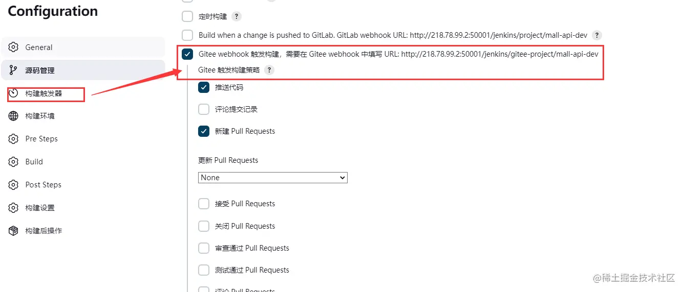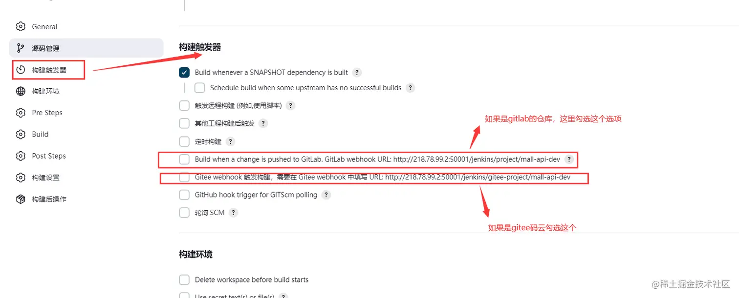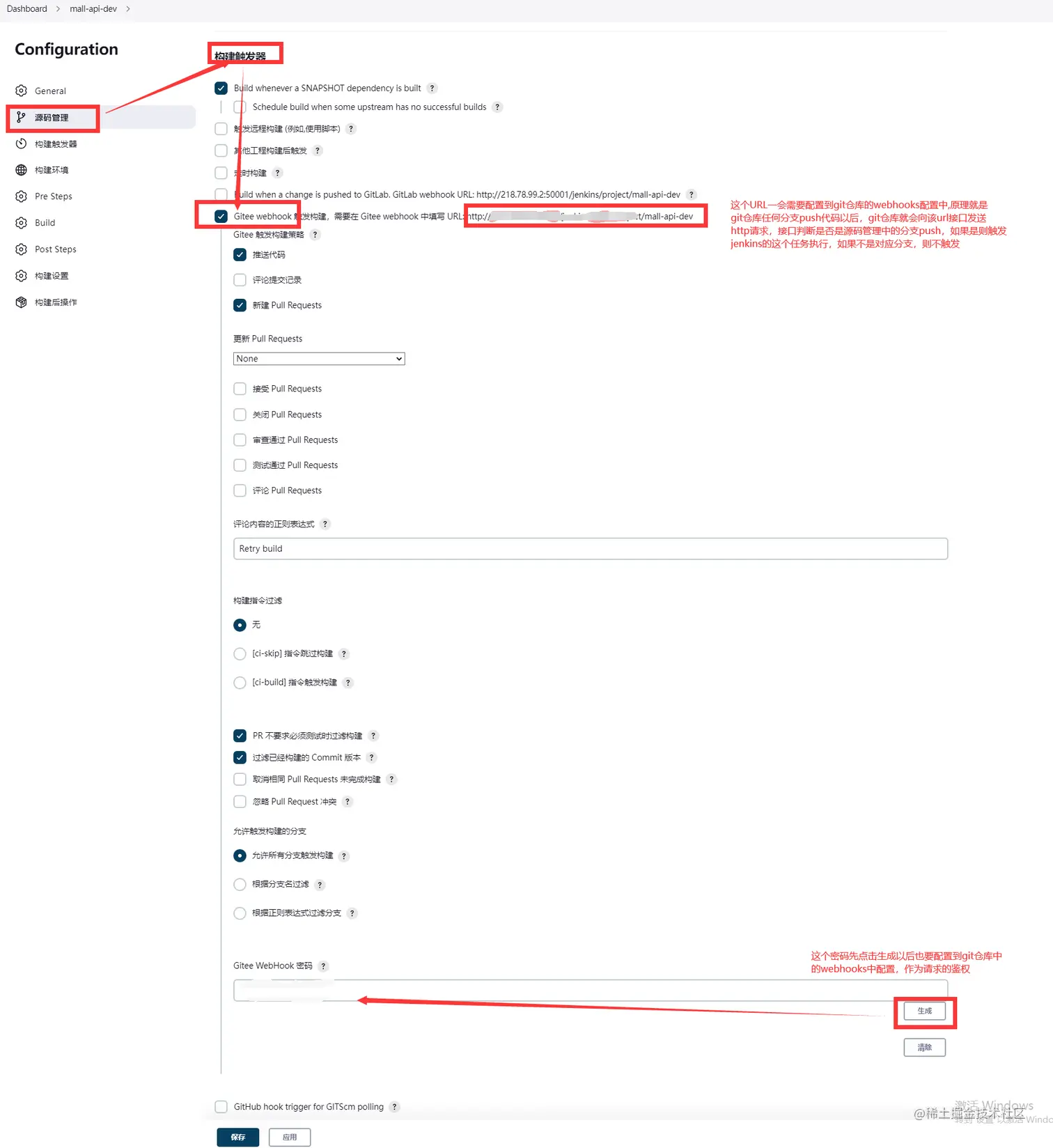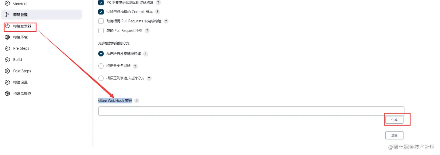 选择构建触发器(根据git仓库的类型选择对应的),下面以gitee为例,勾选Gitee webhook 触发构建,再找到Gitee webhook密码,点击右边的生成按钮,会生成一串密钥,记录下来,一会在gitee仓库去填写该密钥和勾选Gitee webhook 触发构建后面的url, 其他的选项都不同动 就使用默认的,