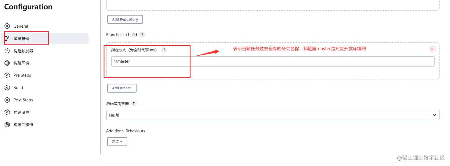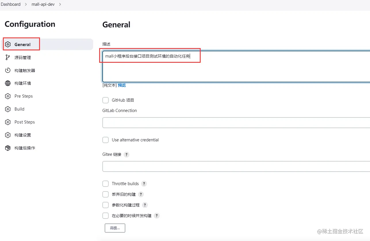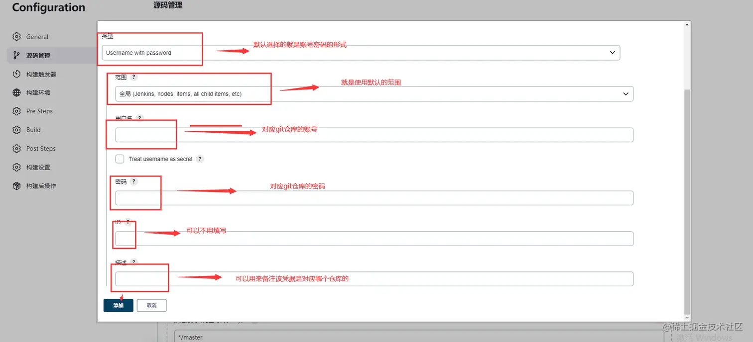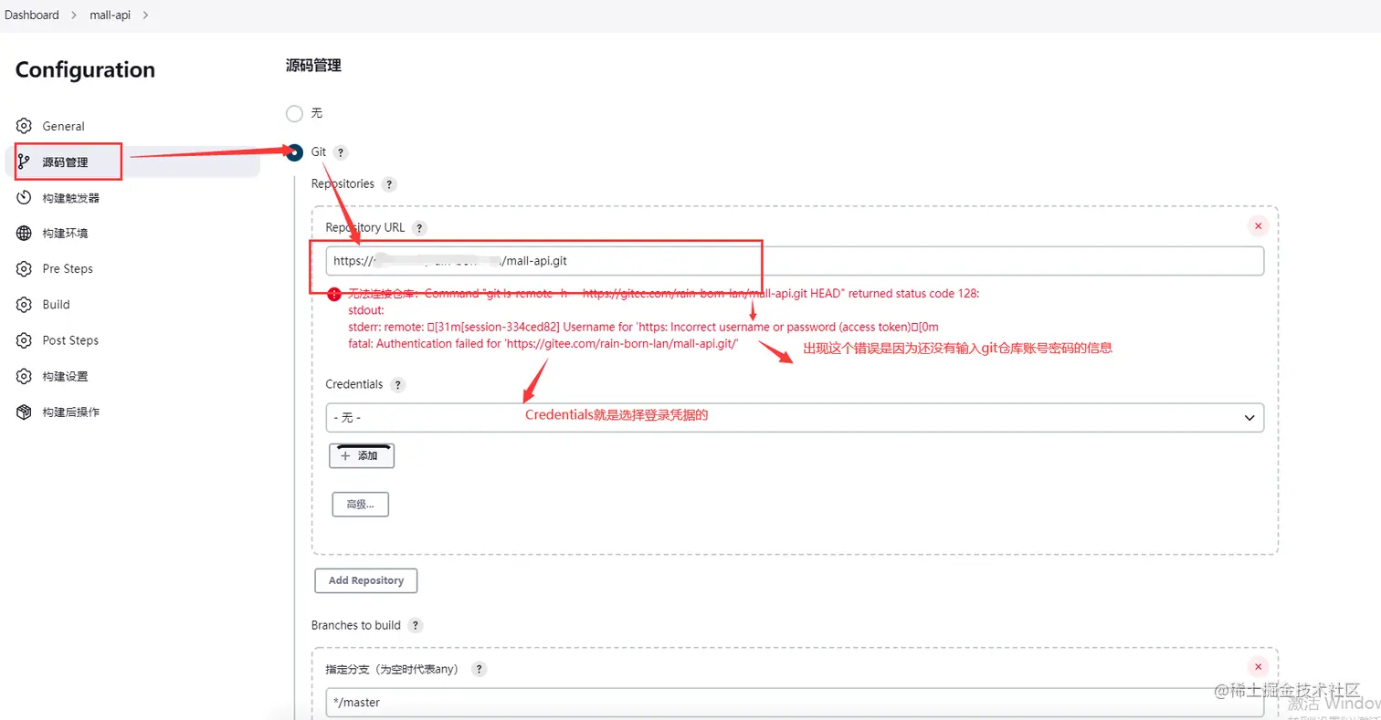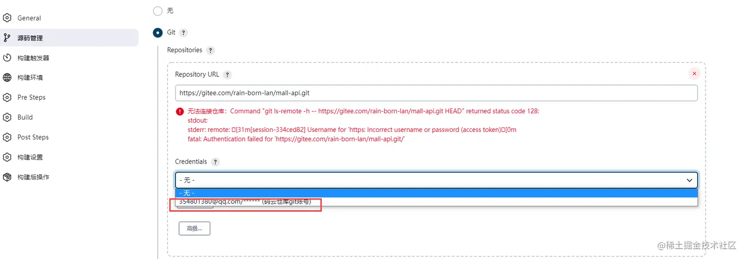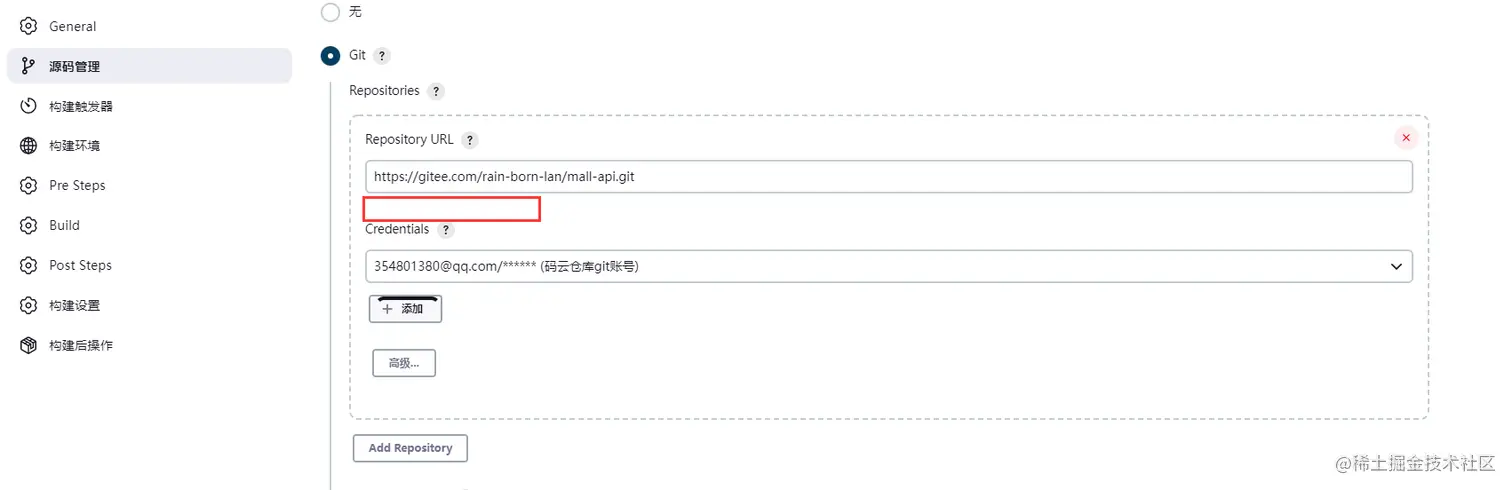 选择源码管理,选择git(不论仓库是github还是gitlab还是gitee都是git类型仓库),填写仓库的clone地址