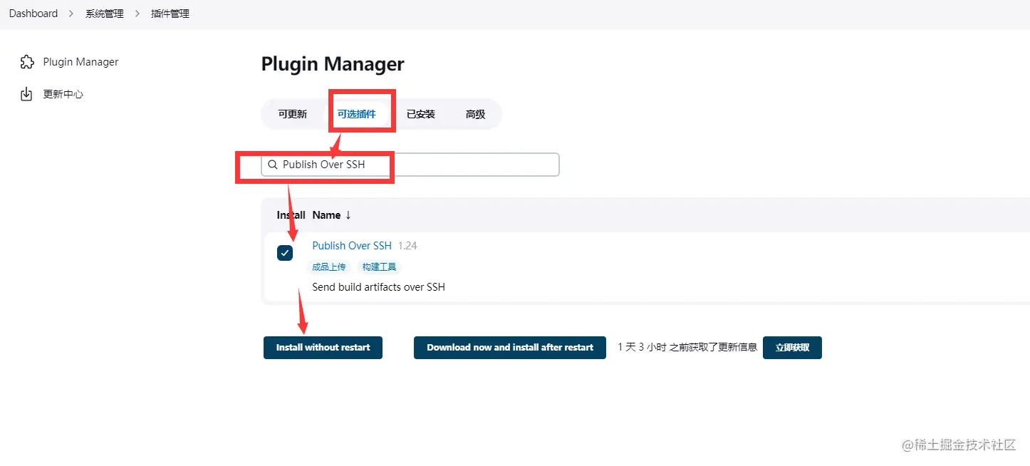 安装Publish Over SSH插件,可以帮助我们将打包的好的jar或者其他文件传送到真正部署的主机,并且执行我们一些脚本来启动运行服务,因为一般部署服务的主机和打包的主机是不同,同样单台主机打包部署也支持发送相关文件,然后给配置over SSH插件