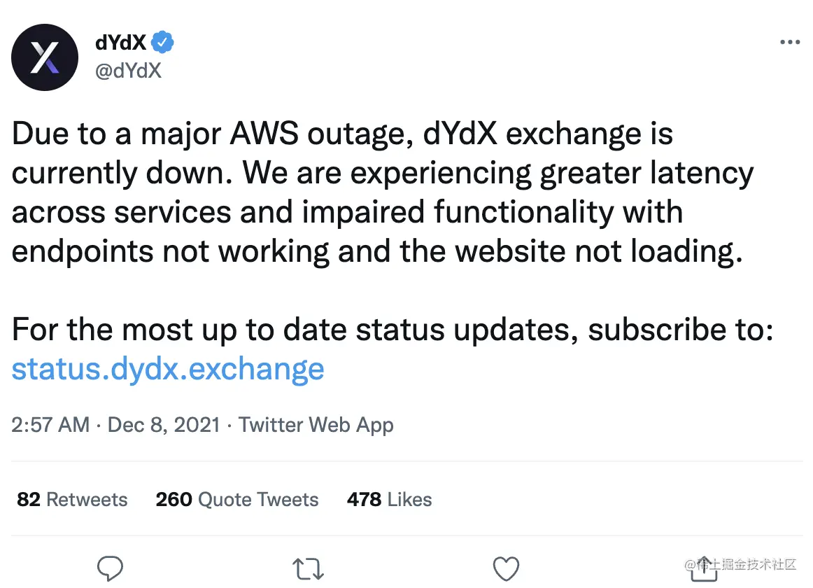 One example is the decentralized exchange dYdX was disrupted for 9 hours on Dec 8, 2021 Monday afternoon to Tuesday morning due to a major outage of Amazon Web Services (AWS), Amazon's cloud services network, which sparked a debate on decentralization.