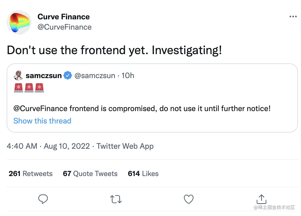 Another problem facing the centralized front-end Dapp is the malicious attack, which took place on Aug 10, 2022. Curve Finance tweeted that they were under attack.