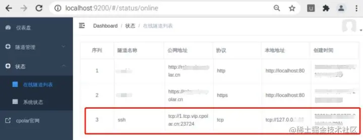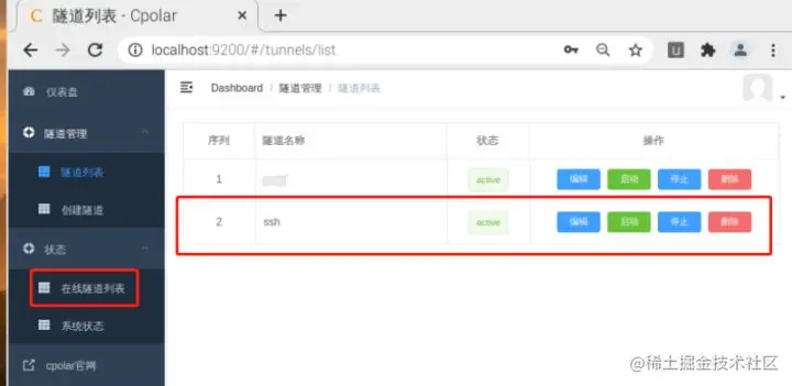 进入cpolar客户端界面后,我们点击左侧的“隧道管理”项,再进入“隧道列表”页面,就能看到cpolar已经自动建立起一条ssh隧道,我们只要确保这条隧道处于启动状态即可。