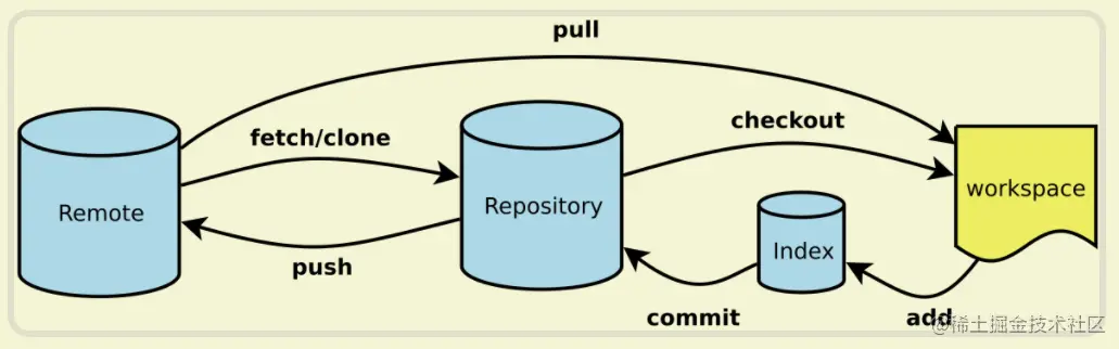 git的操作可以通过命令的形式如执行,日常使用就如下图6个命令即可
