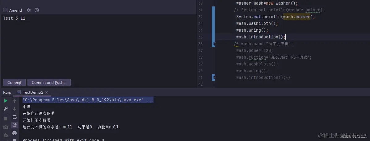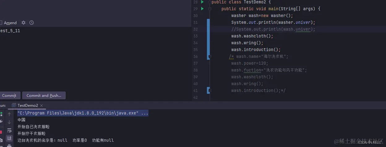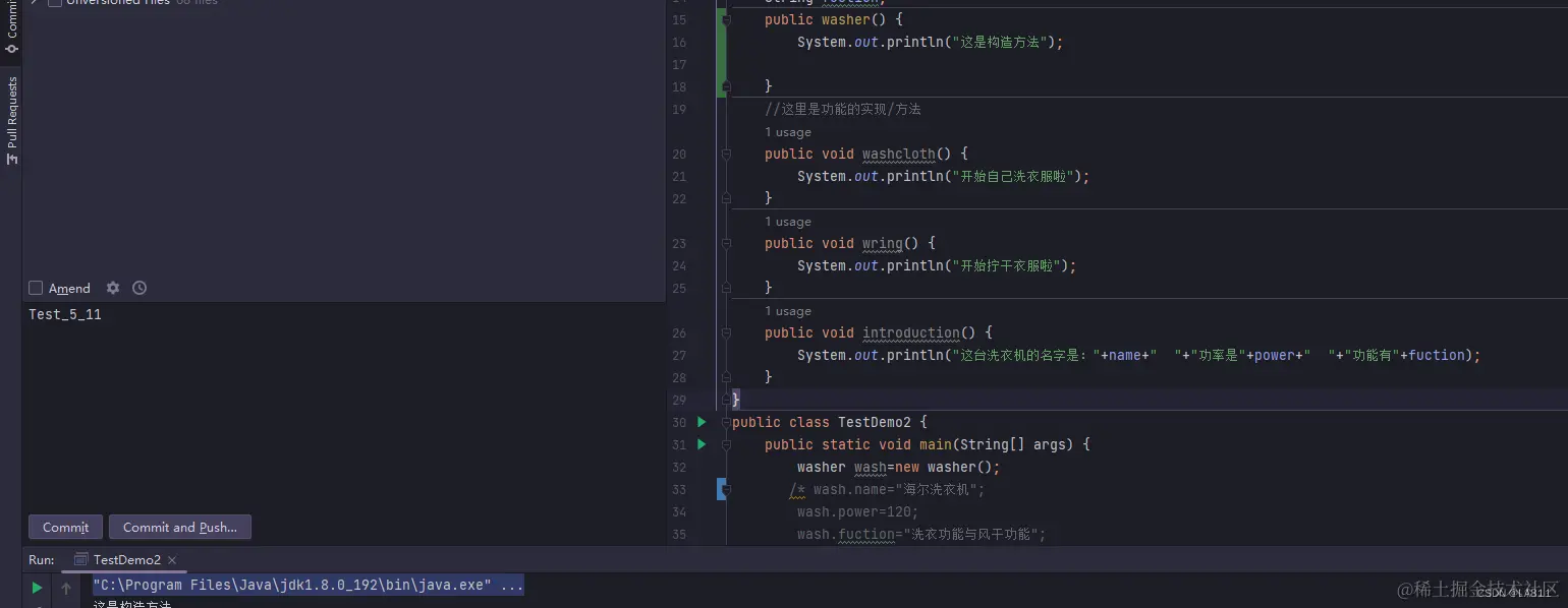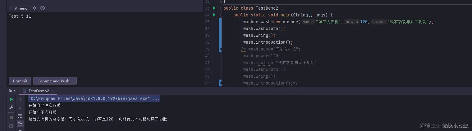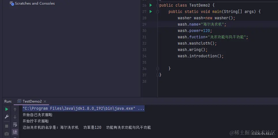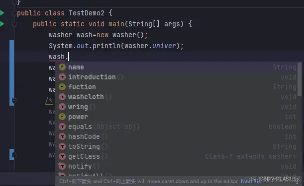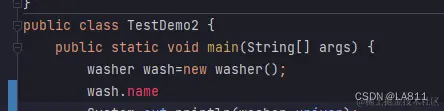 我们在定义完wash后在主方法内部用(对象名+.)的方法来定义内容。这样我们的全部代码就成了这个样子。