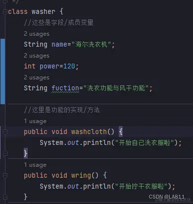 类相似结构体,但是不同,结构体可以定义一些数据值,而结构体内部可以定义字段/成员变量,方法,多了一些过程,就是洗衣服的一系列过程。