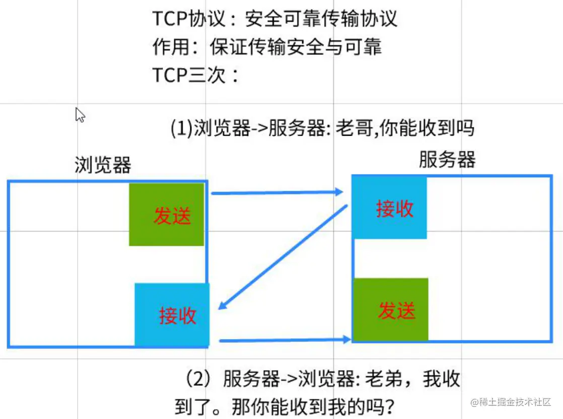 - TCP链接三次握手:建立 安全可靠的传输协议 2.1 TCP:一种传输控制协议 2.2 TCP作用:保证HTTP网络传输是 安全+可靠的(检测客户端 与 服务器的网卡是不是通的) 2.3 TCP三次握手: 第一次:浏览器 -> 服务器 第二次:服务器 -> 浏览器 第三次:浏览器 -> 服务器