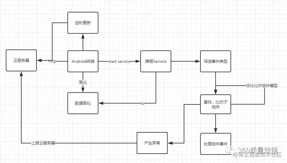 云配置是在云端拉取弹框配置数据,动态固化到本地,uiautomator监听OnAccessibilityEventListener,拉取固化本地数据,进行弹框处理。架构图如下图所示: