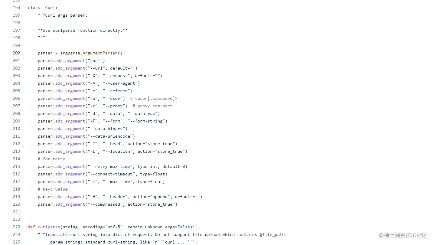 这里是主要的解析方法,利用ArgumentParser他把curl字符串解析成各个属性的方法,代码如下: