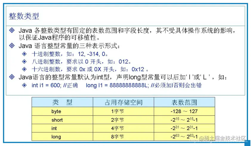 * 整数类型:byte short int long