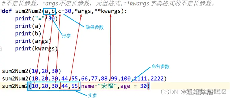 | #不定长参数,args 以元组格式存储数据(有就变成不定长参数)#让很多数相加def sum2Num2(a,b,*args): print("="*30) print(a) print(b) print(args) result = a+b for num in args: result +=num print("ta们的和是:%d"%result)sum2Num2(11,22,33,44,55,66)sum2Num2(11,22,33)sum2Num2(11,22)#sum2Num2(11) #错误,至少要传递没有传递的形参 |