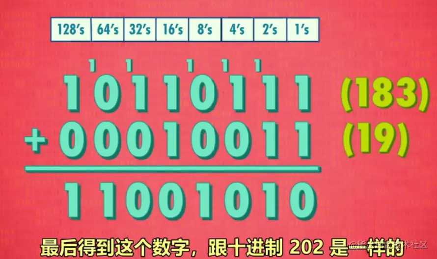 和十进制一样,只不过是满二进1。如果已经是2了还要进1就是3转换为二进制就是11,因此满的那个位数表示为1,进的1再向下传递。比如下面这个运算。
