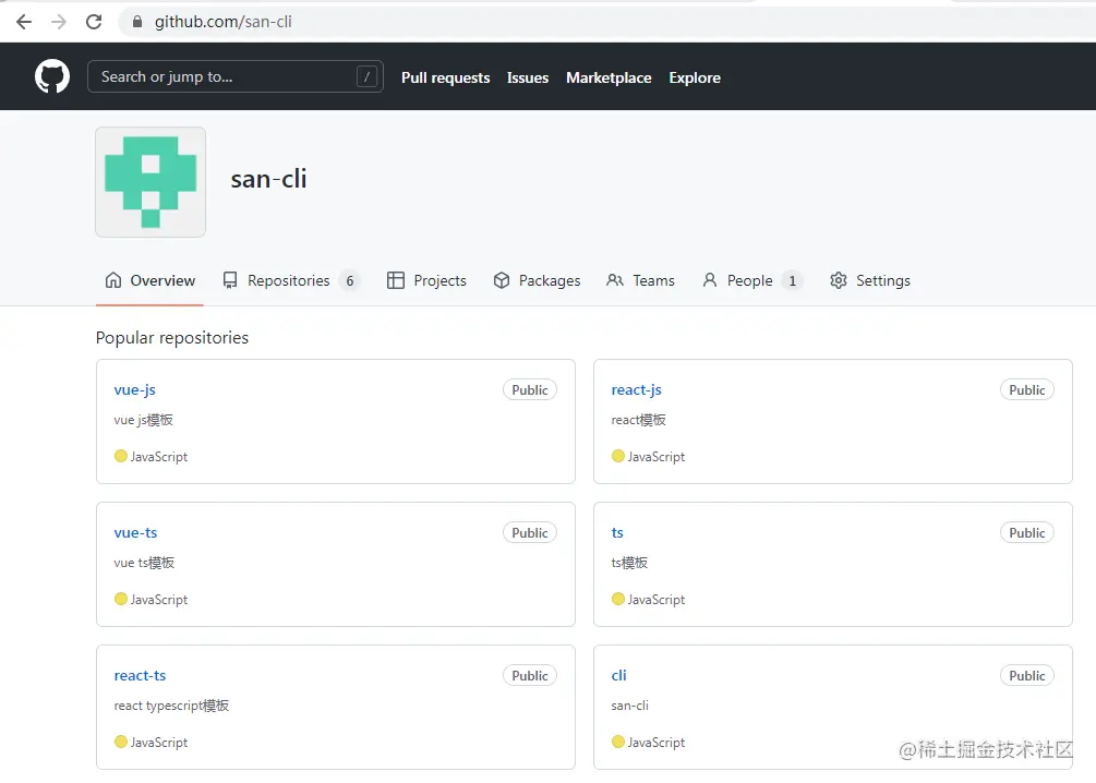 由于我提供了交互,我将根据交互结果为用户提供指定的模板。为了更好的管理模板,建议创建一个组织。下面san-cli就是我的组织,在组织里面可以创建很多仓库。